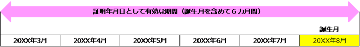 添付する書類の証明日は、誕生月を含めて過去6カ月以内に証明を受けたものが有効です。 例えば、8月生まれの方は、次の期間に証明を受けたものを添付します。