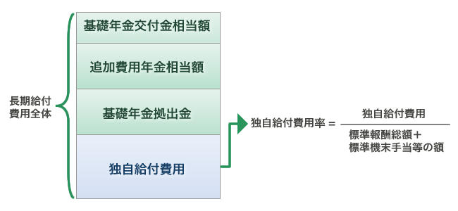 注: 独自給付費用とは、ある年度の実質的な支出のうち、保険料拠出によって賄う部分(国庫・公経済負担を除いたもの)から基礎年金拠出金を控除したものです。したがって、長期給付費用全体からは、基礎年金交付金相当額、追加費用相当額、基礎年金拠出金(このうちの1/3は公経済負担)が除かれています。独自給付費用が当該年度の標準報酬総額と標準期末手当等の合計額に占める割合を独自給付費用率といいます。