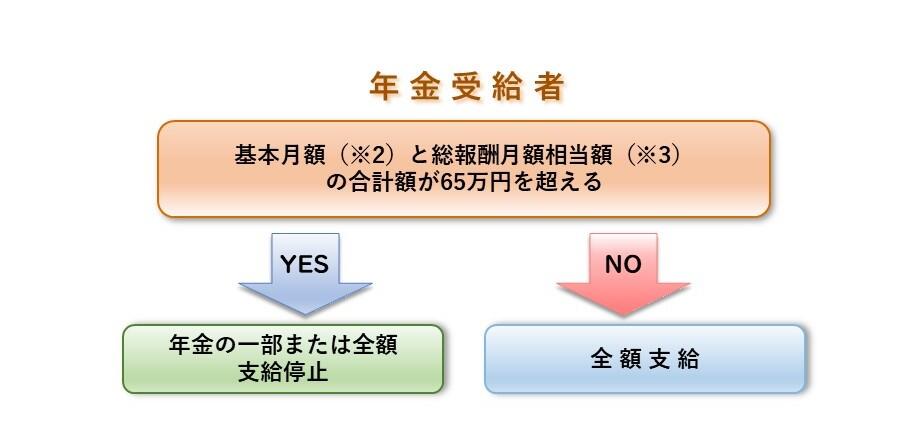 老齢厚生年金を受けている方が、厚生年金保険の被保険者等(※1)となって、「賃金+年金」の月額が一定の金額(65万円)を超えた場合、年金の一部または全部が支給停止となります。